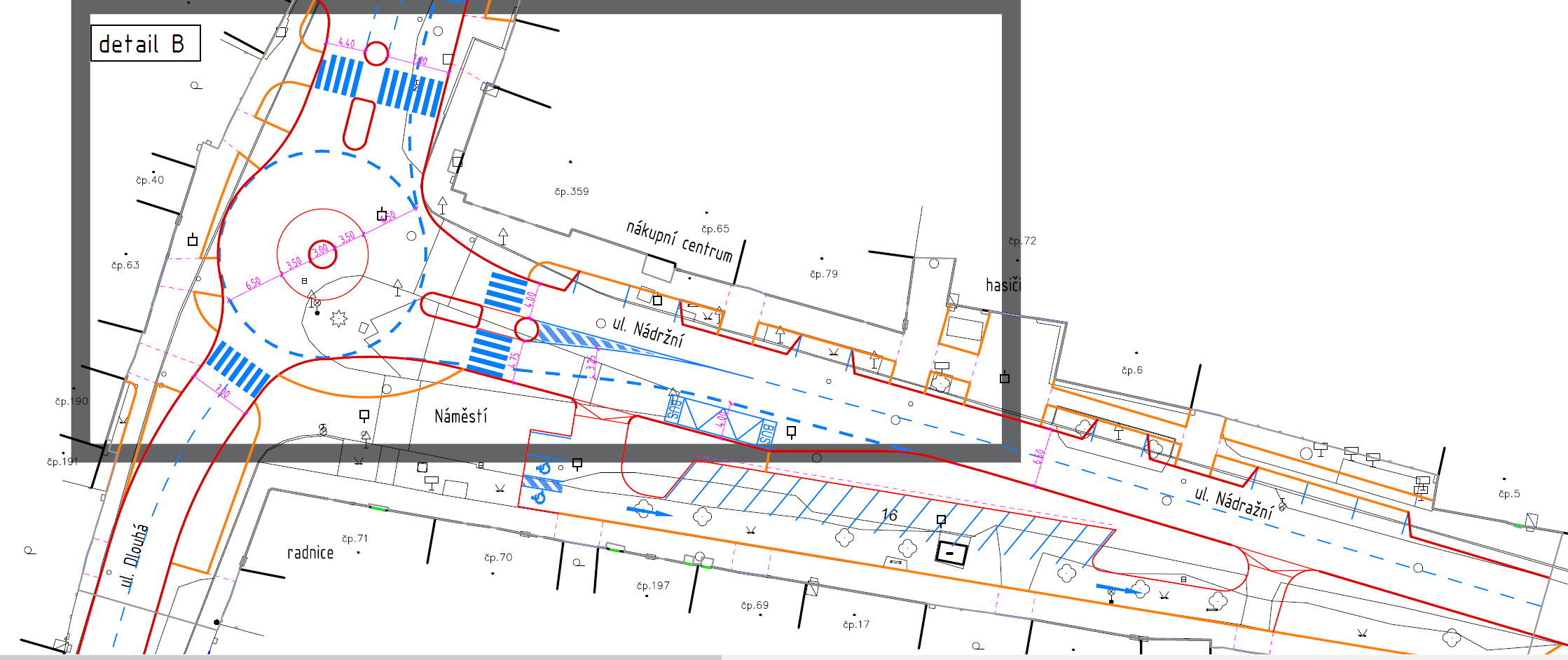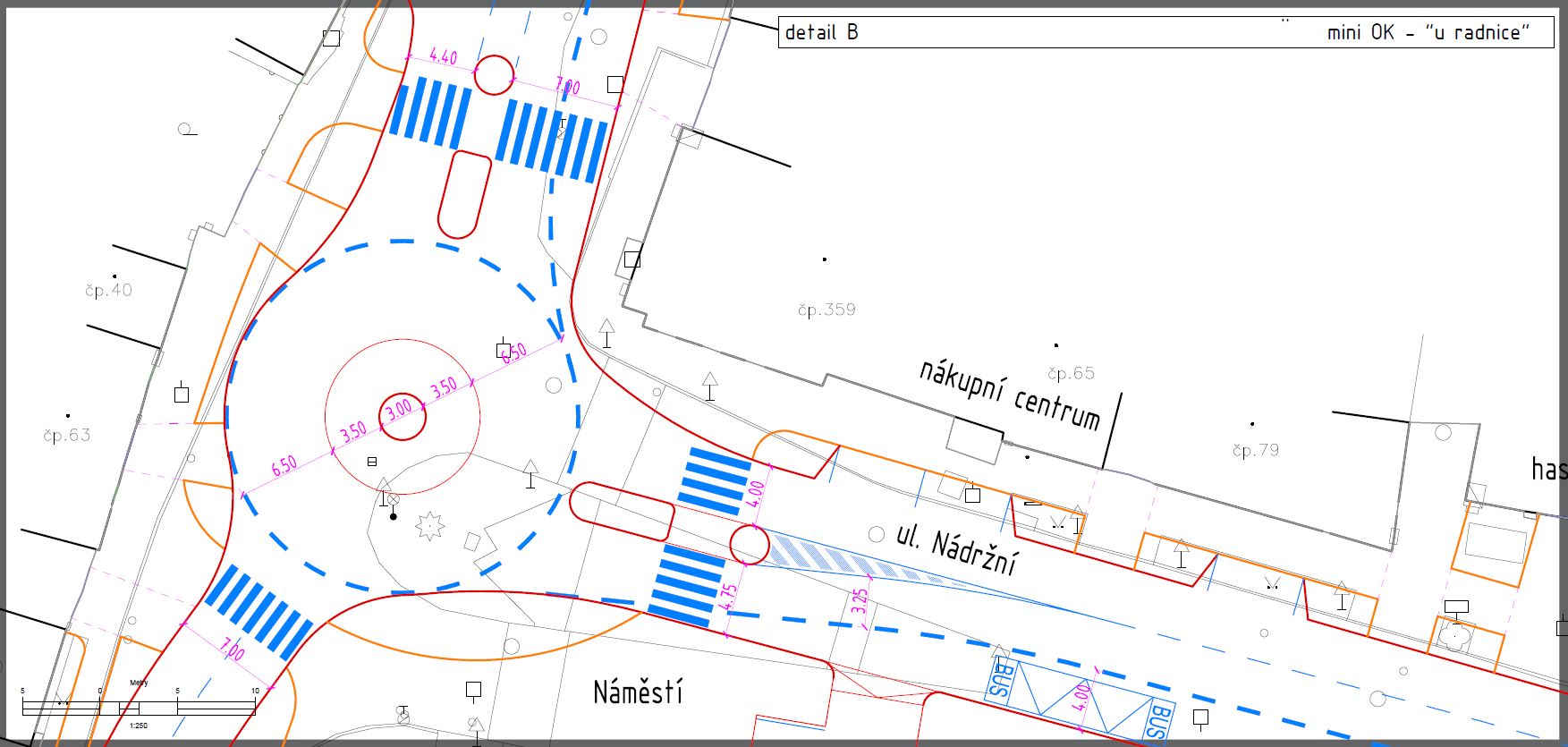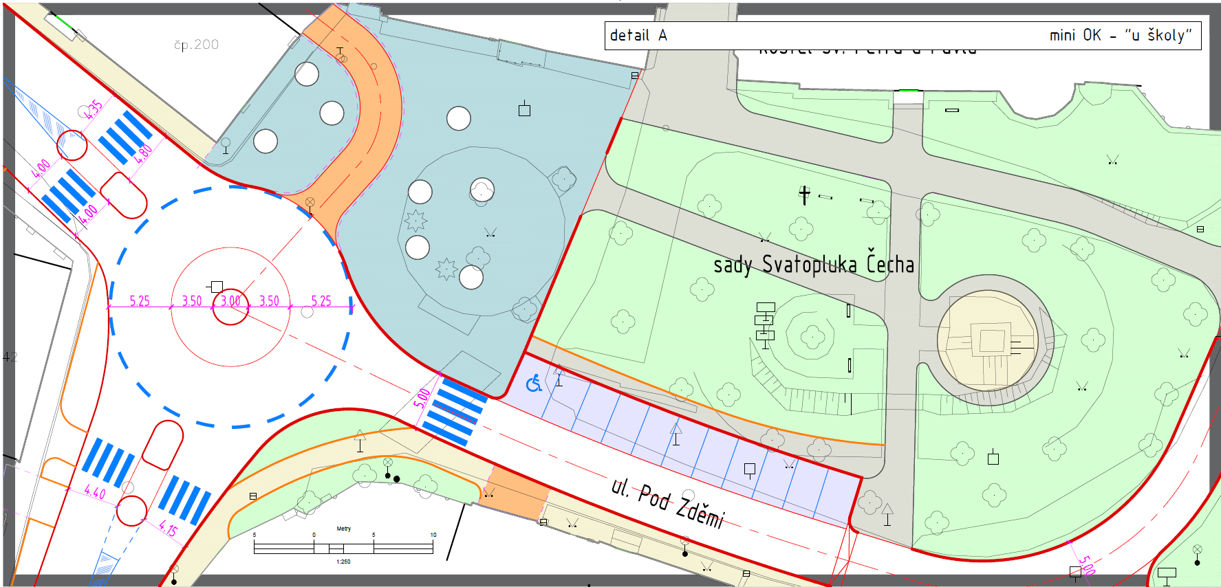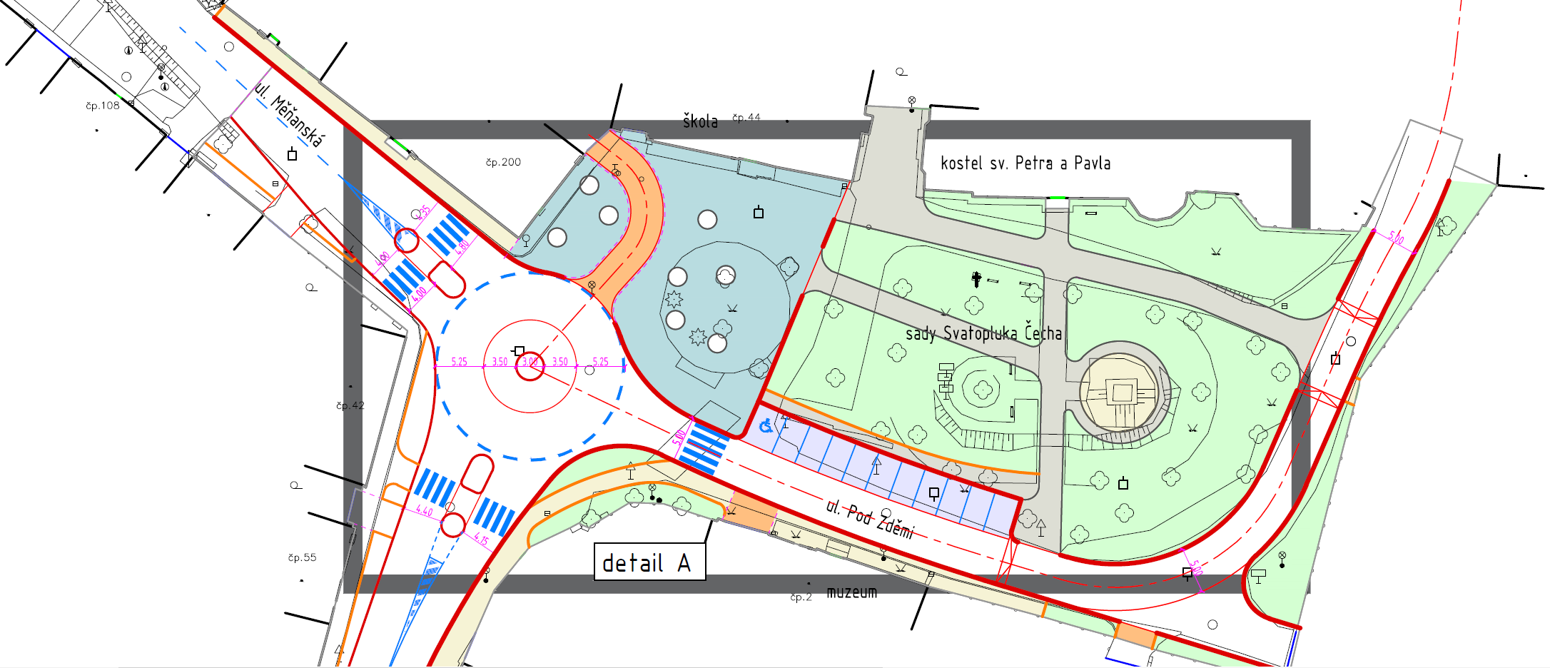 Maximalizovali jsme průjezdní šíři alespoň jednoho jízdního pruhu na min. 4.40m (tedy projede i velmi nadrozměrný nadrozměr a nebude nám ničit chodníky a obrubníky)