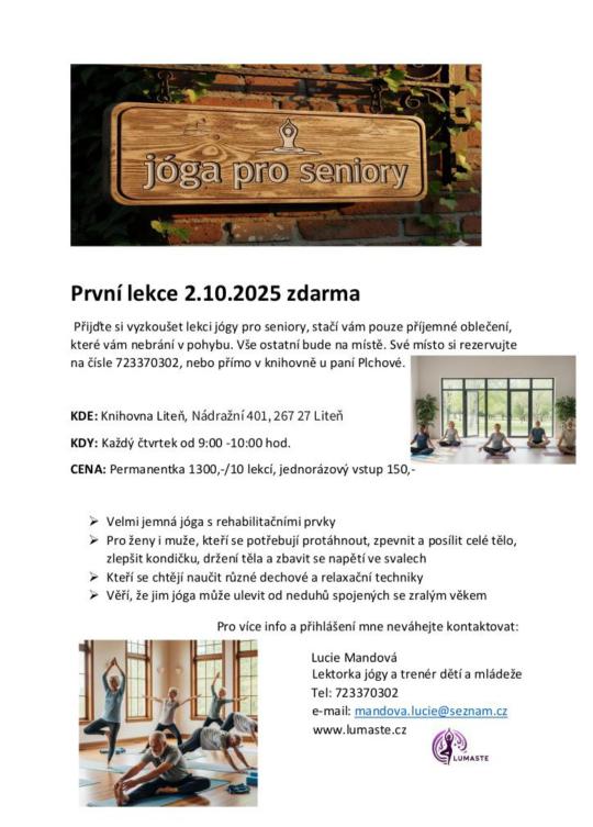 Paní Mandová povede kurzy jógy v Litni nyní již pro všechny věkové kategorie. V případě zájmu, více informací v přiložených letáčcích.